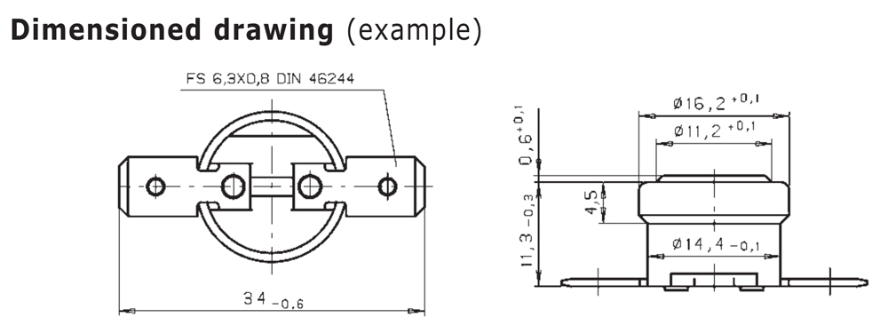 Thermo switches only react when external thermal heating affects them. The thermal coupling to the source of heat is effected by means of a bimetal disk lying directly below the metallic covering cap.